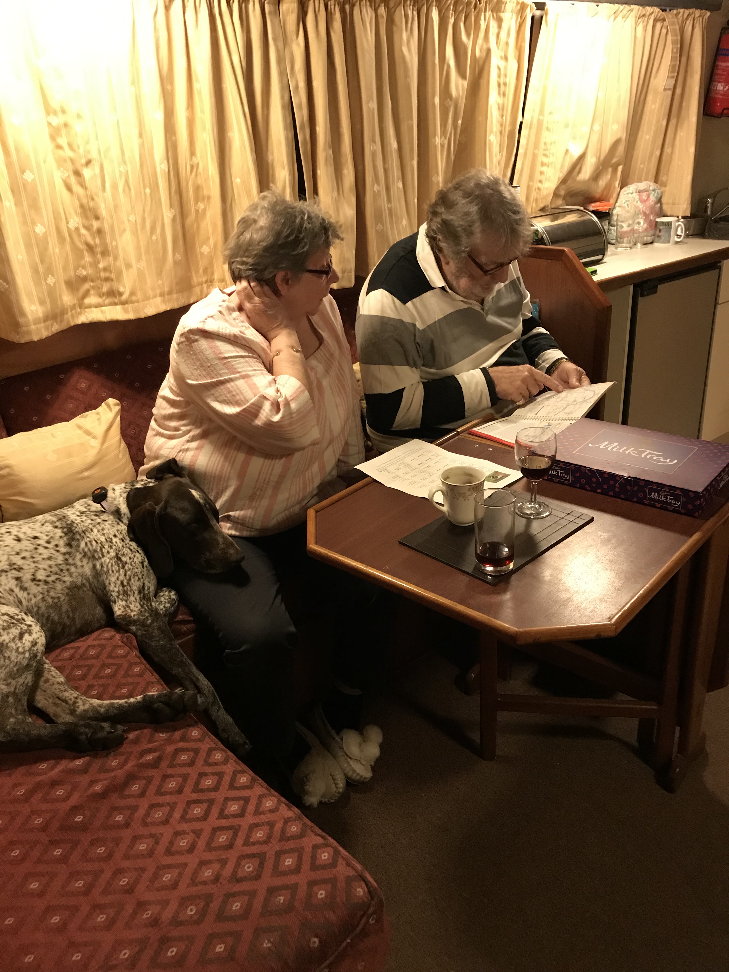 A tired Henny, Penny the Purser & Captain Colin Day 2 in the planning with a drink and a box of birthday chocs.